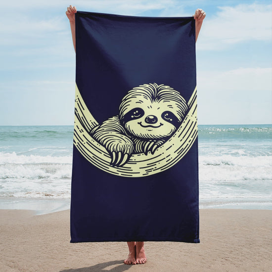 Bring laid-back laughs to the beach with this vibeful sloth towel! Featuring an art deco design full of retroeful charm, it's the ultimate funny sloth holiday gift. Perfect for sloth lovers who enjoy relaxing in style, this chill and relaxing towel is all about good vibes and giftful fun.